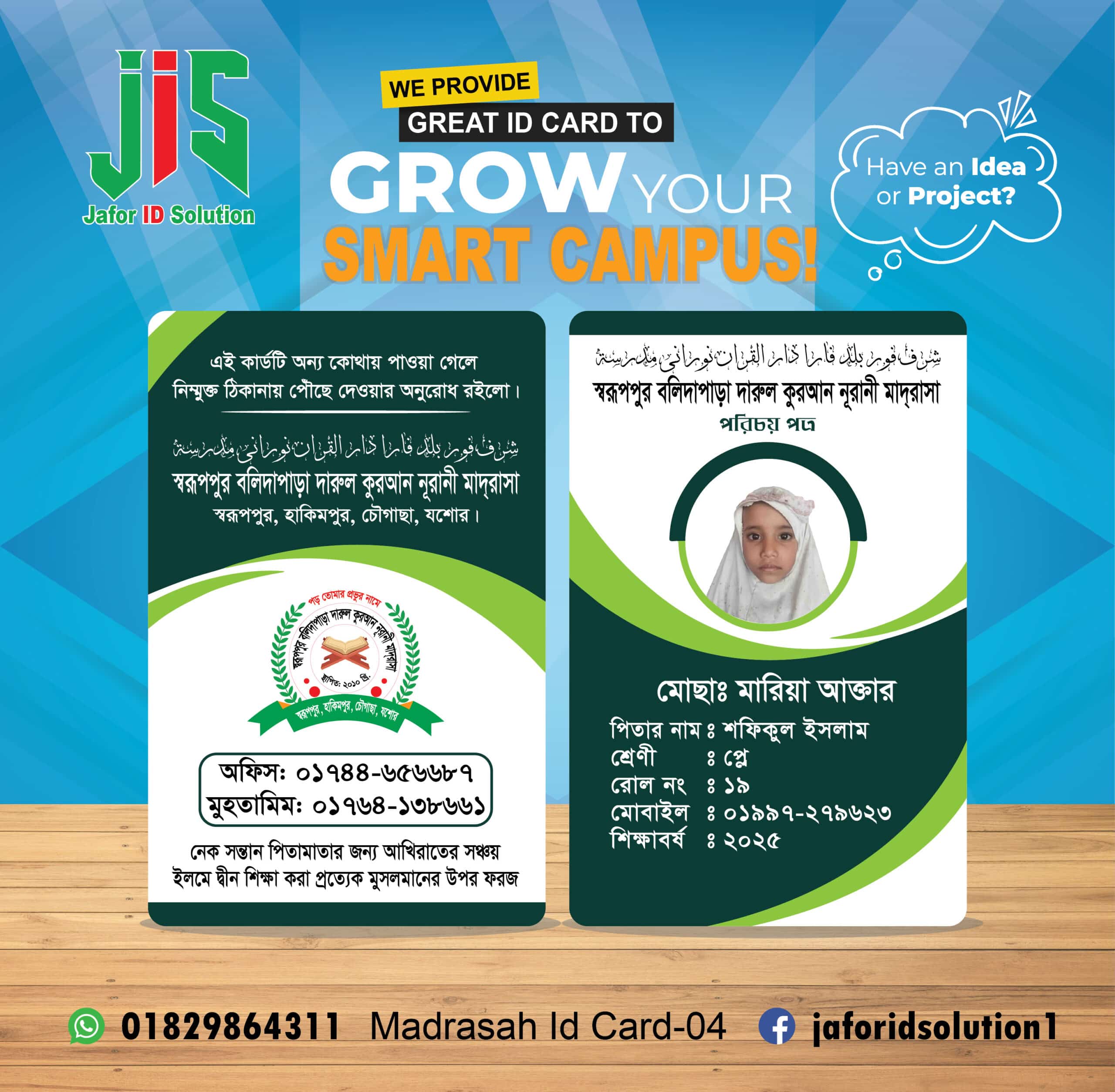 আপনার স্কুল, কলেজ, মাদ্রাসা বা প্রতিষ্ঠানের জন্য স্টাইলিশ এবং নিরাপদ আইডি কার্ড তৈরি করতে আমরা আছি আপনার পাশে!
